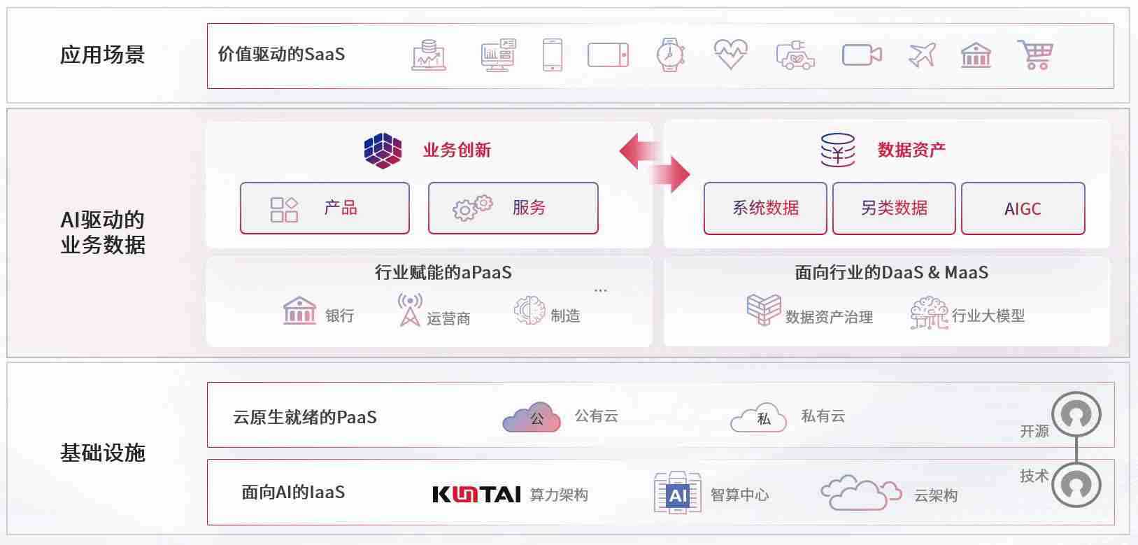 数字时代,,,,围绕企业数字化转型的关键要素,,,J9娱乐数码开创性的提出数云融合战略和技术体系框架,,,,着力在云原生、、、、数字原生、、AI原生和信创产业上架构产品和服务能力,,,为处在不同数字化转型阶段的快消零售、、汽车、、、金融、、、医疗、、、政企、、教育、、、运营商等行业客户提供泛在的敏捷IT能力和融合的数据驱动能力,,,构建跨界融合创新的数字业务场景和新业务模式,,助力企业级客户建立面向未来的核心能力和竞争优势,,,全面推动社会的数字化、、、、智能化转型升级。。